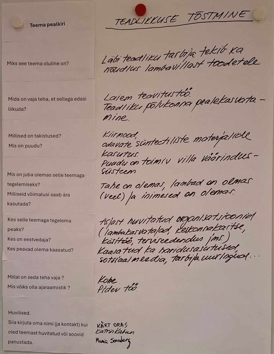 Ettevõttekülastusele ja ettekannetle järgnes innovatsioonipäeval osalejate arutelu selle üle, mida on Eesti lambavilla veel paremaks väärindamiseks ära teha ja kuidas neid mõtteid ellu viia.