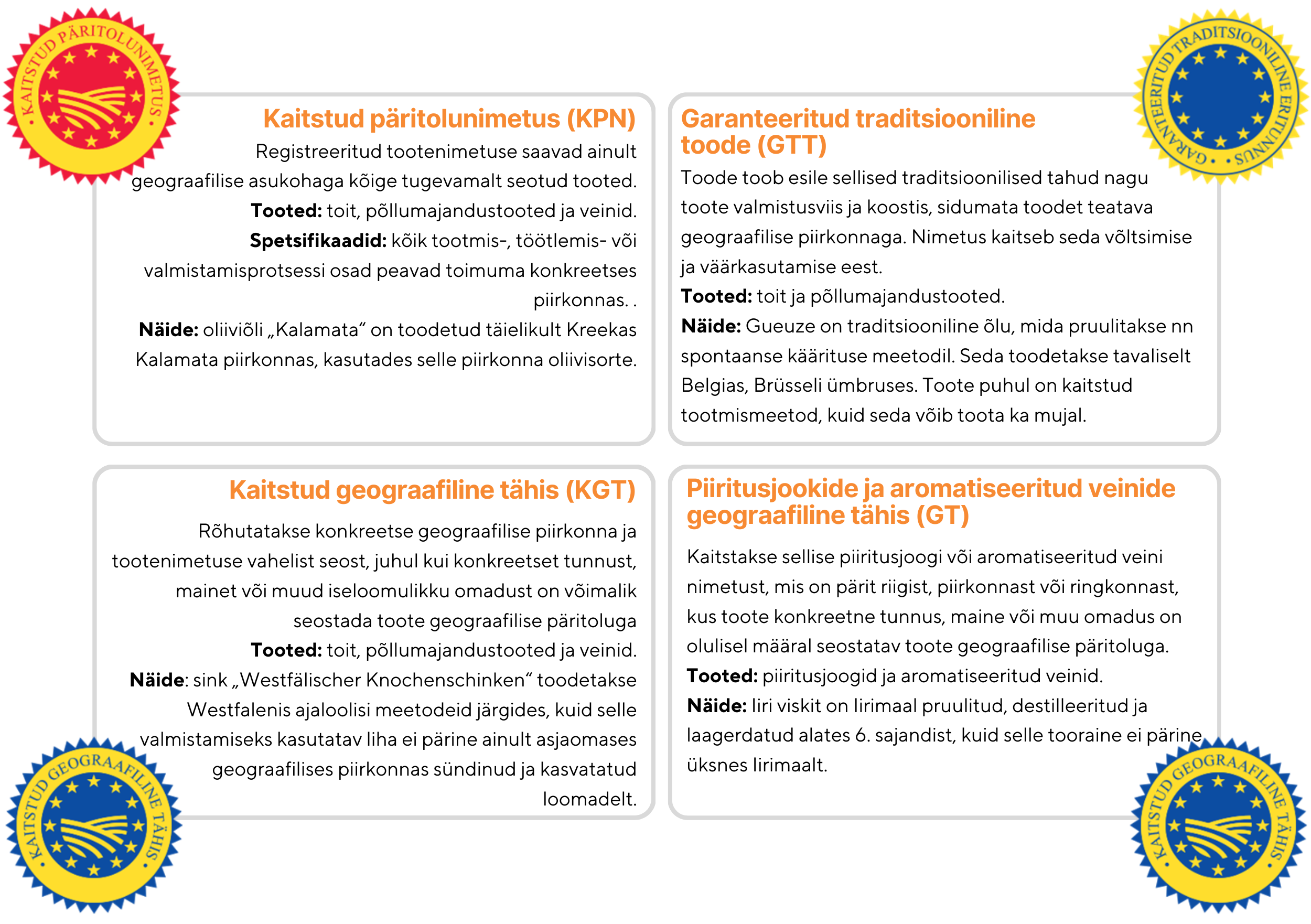 Kaitstud geograafiline tähis (KGT) – antud märgist on võimalik taotleda toodetele, millel on tugev seos kindla geograafilise piirkonnaga, kus vähemalt üks tootmisetapp toimub.