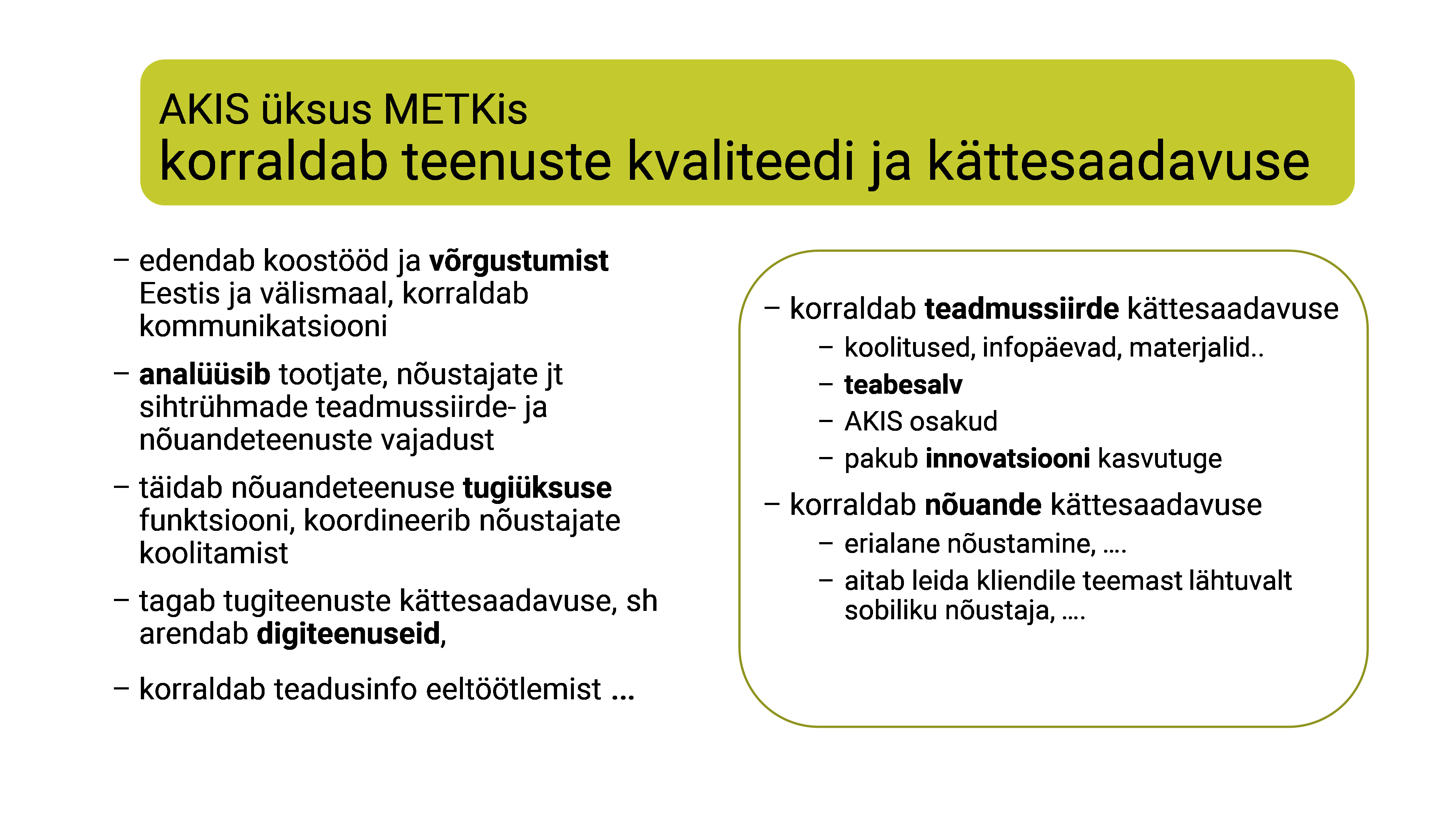 AKIS tugistruktuuri loomine METKi juurde aitab tuua teadmussiirde- ja nõuandeteenuste korraldusse rohkem stabiilsust, koondada ja arendada valdkonna kompetentsi pikaajalisemas vaates, vähendada projektipõhisust ning tegevuste otsesest sõltuvust struktuurifondide rahastamisperioodidest. METK ülesanne on ühise infovälja tugevdamine erinevate AKIS osaliste vahel ja tervikvaatest lähtuv tegevuste kavandamine.